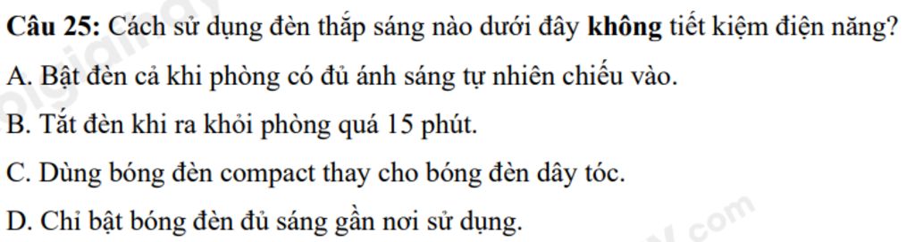 `A.`Bật đèn cả khi phòng có đủ ánh sáng tự nhiên chiếu vào không tiết kiệm điện năng vì đèn sẽ hoạt động mặc dù không cần thiết khi có đủ ánh sáng tự nhiên