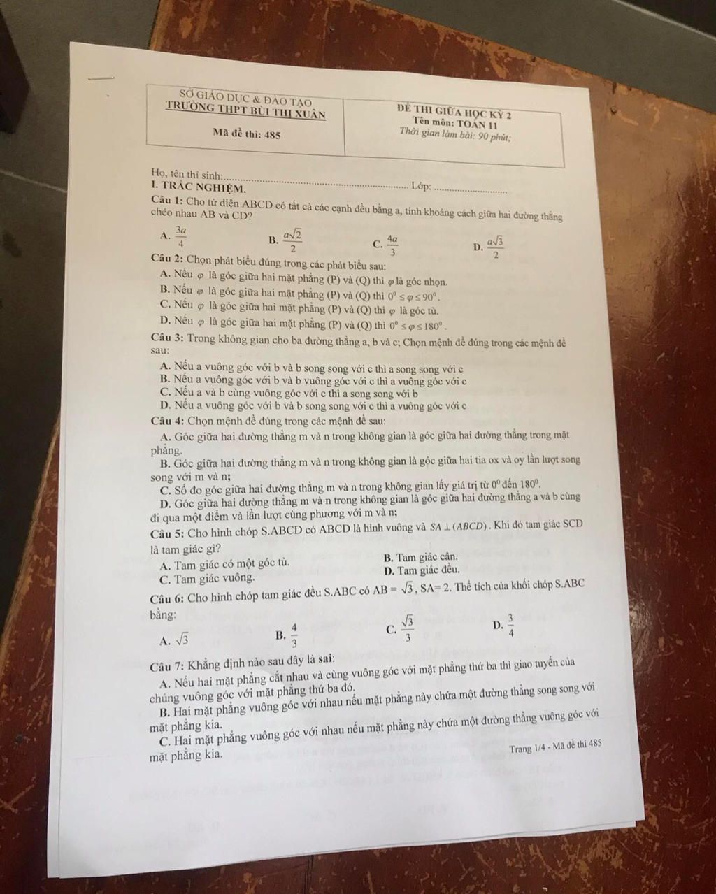Câu 1: Cho tử diện ABCD có tất cả các cạnh đều bằng a, tỉnh khoảng cách giữa hai đường thẳng