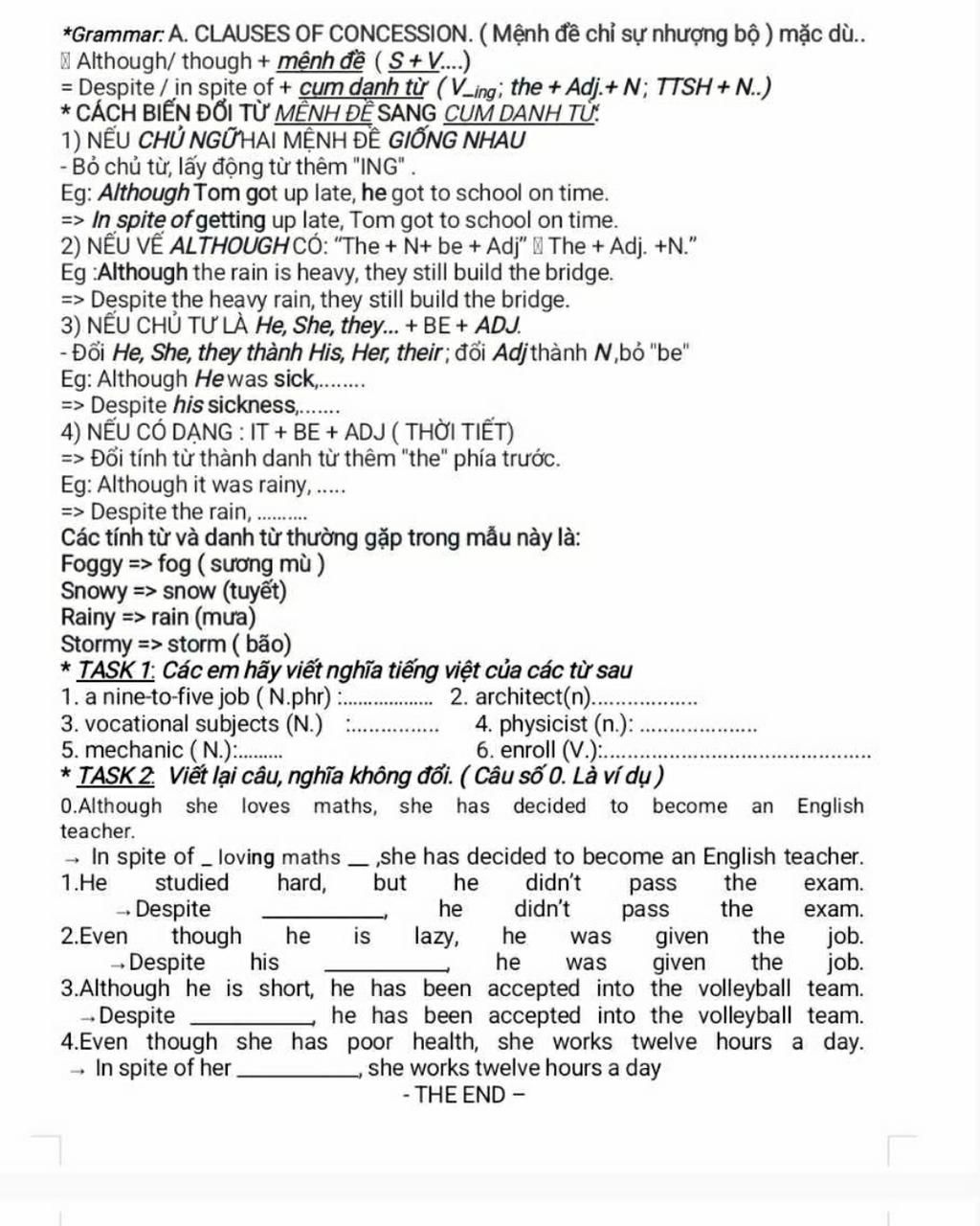 *Grammar: A. CLAUSES OF CONCESSION. ( Mệnh đề chỉ sự nhượng bộ ) mặc dù..