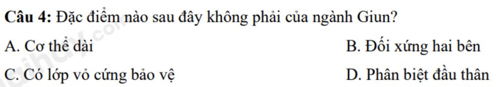 Giải thích các bước giải: Các động vật thuộc ngành Giun có cơ thể khá dài, phân biệt được đầu và thân và cơ thể có hai bên đối xứng nhau; Lớp vỏ cứng bảo vệ là đặc điểm của các động vật ngành Thân mềm