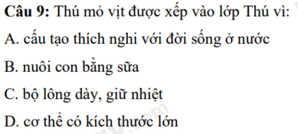 `->` Thú mỏ vịt có cấu tạo cơ thể thích nghi với việc sống ở môi trường nước