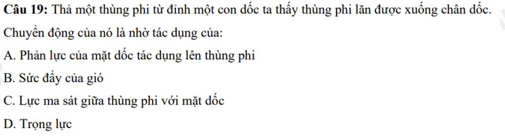 Câu 19: Thả một thùng phi từ đỉnh một con dốc ta thấy thùng phi lăn được xuống chân dốc. Chuyển động của nó là nhờ tác dụng của: