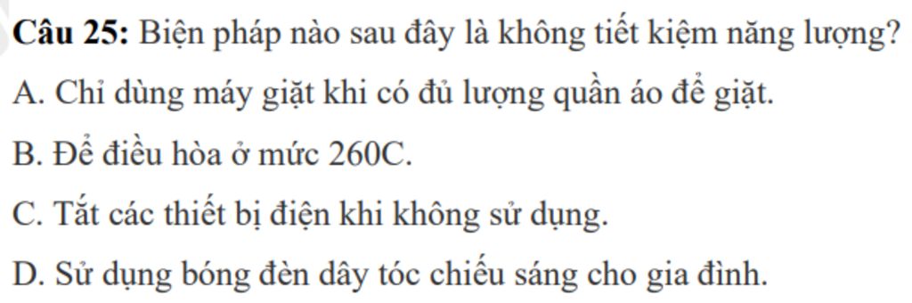 `-` Giải thích : Biện pháp không tiết kiệm năng lượng là sử dụng bóng đèn dây tóc chiếu sáng cho gia đình vì bóng đèn dây tóc tiêu thụ nhiều điện năng để sáng