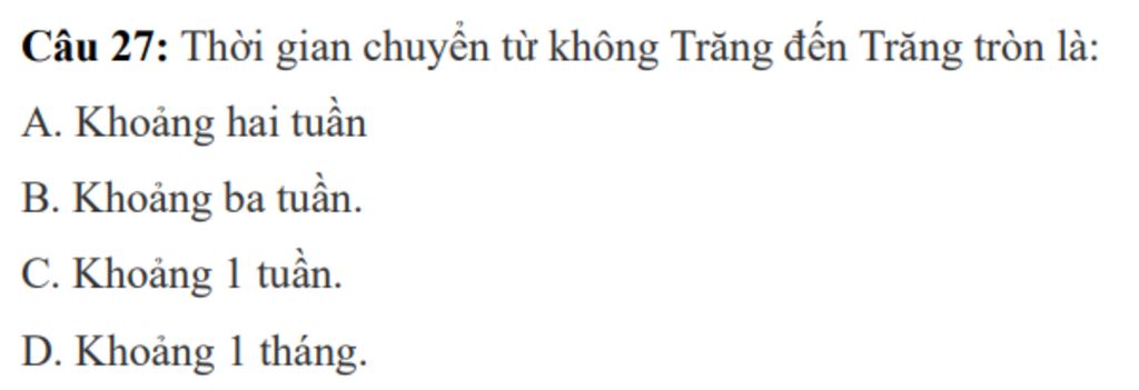 `A.` Khoảng hai tuần. Chu kỳ của các tuần trăng, bao gồm cả thời gian từ Trăng không Trăng (Trăng non) đến Trăng tròn, diễn ra trong khoảng `29.5` ngày, tức là khoảng hai tuần để chuyển từ pha này sang pha khác.
