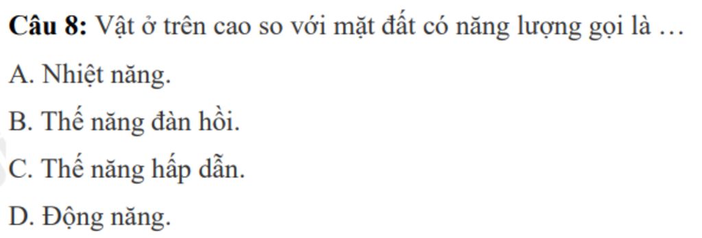 `@`Vật ở trên cao so với mặt đất có năng lượng gọi là thế năng hấp dẫn vì Thế năng hấp dẫn là dạng năng lượng do vị trí trong trường trọng lực của Trái Đất