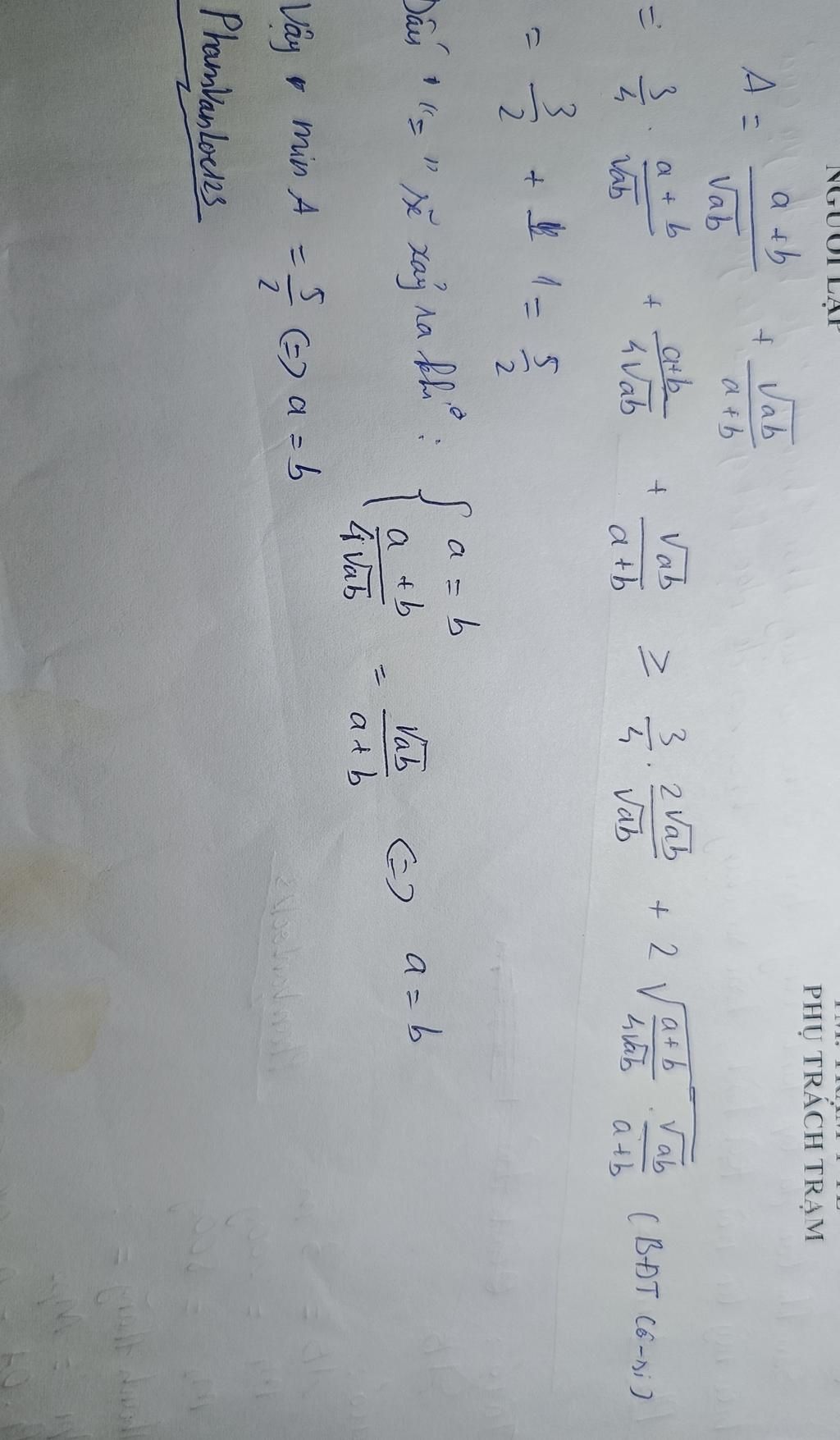 Tìm GTNN của `A= (a+b)/\sqrt{ab}+\sqrt{ab}/(a+b)`