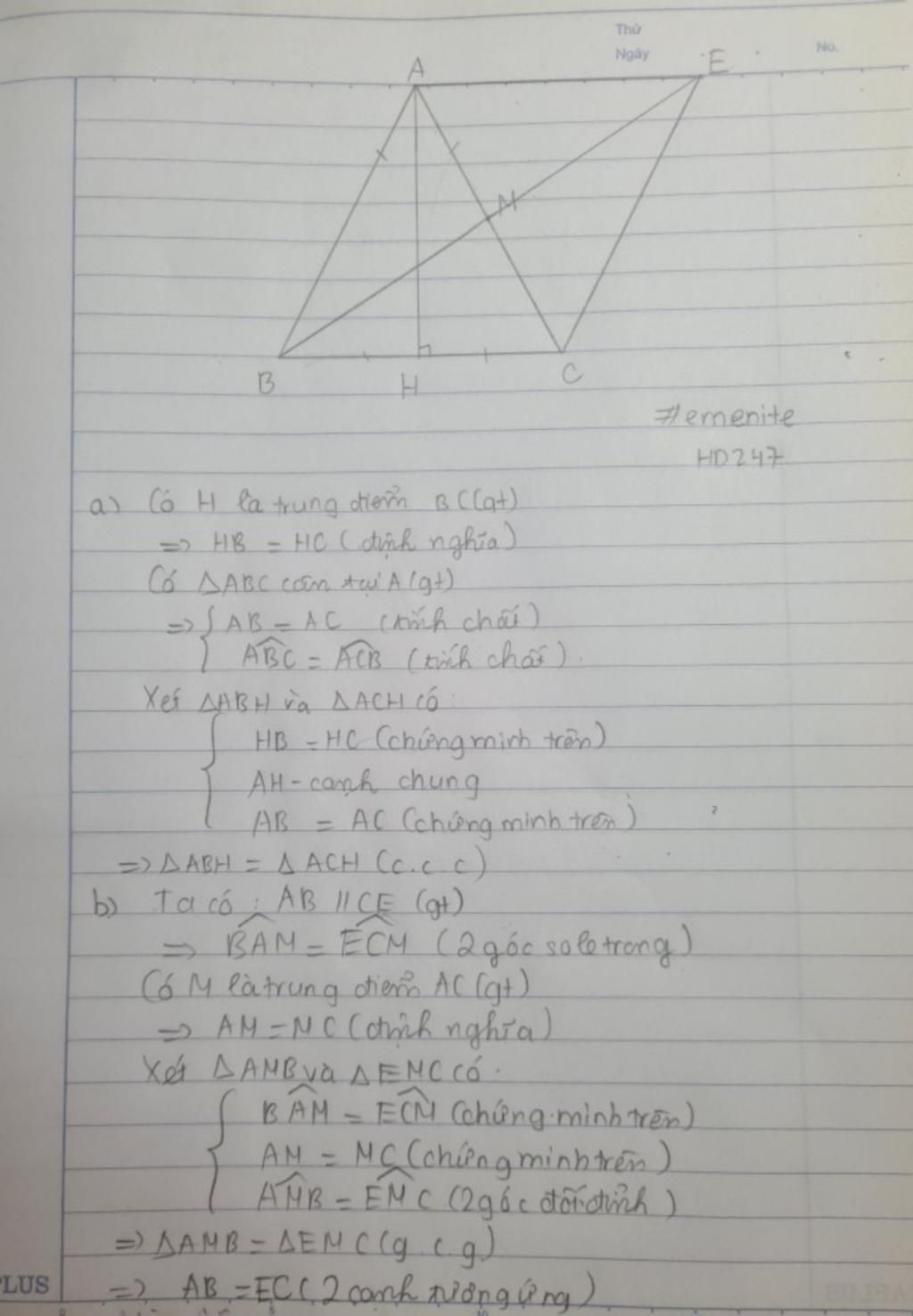 a) chứng minh tam giác ABH = tam giác ACH b) gọi M là trung điểm của AC, đường thẳng C và song song với AB cắt BM tại E chứng minh AB=CE