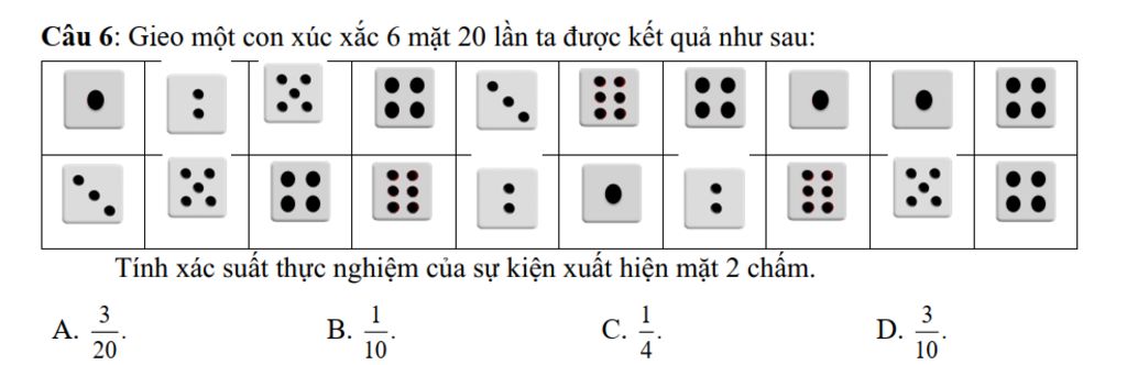 `@` Gieo xúc xắc `20` lần ta được số lần mặt `2` chấm là `3` lần
