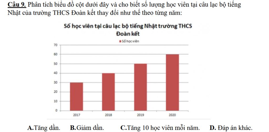`@` Nhìn biểu đồ ra thấy số lượng học viên tại câu lạc bộ tiếng Nhật của trường THCS Đoàn kết tăng dần theo từng năm vì cột số học sinh mỗi năm đều tăng.