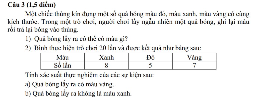 `1)` Qủa bóng lấy ra có thể có màu`:` Xanh`;` Đỏ`;` Vàng`.`