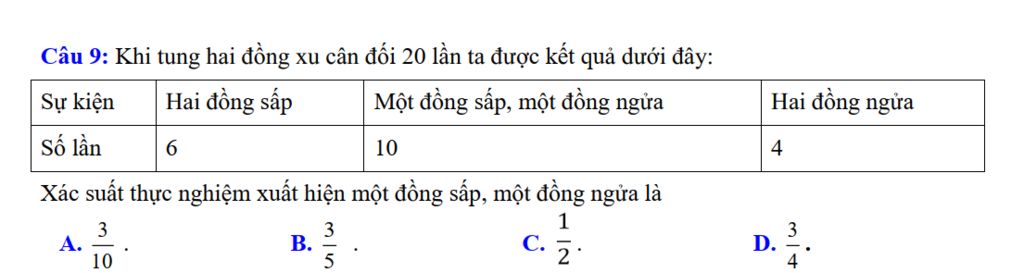 Xác suất thực nghiệm xuất hiện `1` đồng sấp, `1` đồng ngửa là:
