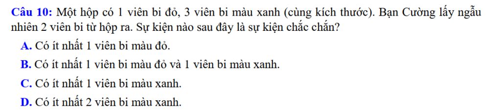 `A:` Không chắc chắn vì có thể lấy ra `2` viên màu xanh