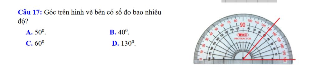 Theo hình vẽ thì ta có số đo góc trên là `50^o` kể từ điểm `0^o` đến `130^o` vạch đỏ