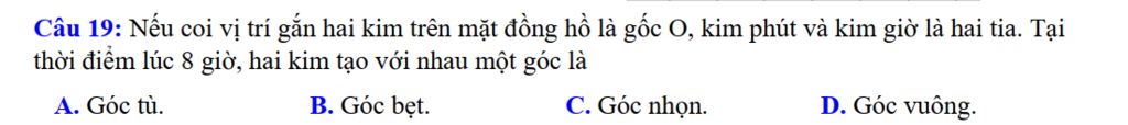 `=>` Lúc `8` giờ thì kim phút và kim giờ tạo thành `1` góc lớn hơn góc vuông mà lại nhỏ hơn góc bẹt
