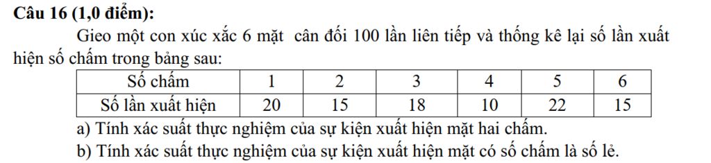 `b)` Xác suất thực nghiệm của sự kiện xuất hiện mặt có số chấm là số lẻ là :