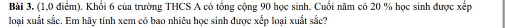 Bài 3. (1,0 điểm). Khối 6 của trường THCS A có tổng cộng 90 học sinh. Cuối năm có 20 % học sinh được xếp loại xuất sắc. Em hãy tính xem có bao nhiêu học sinh được xếp loại xuất sắc?
