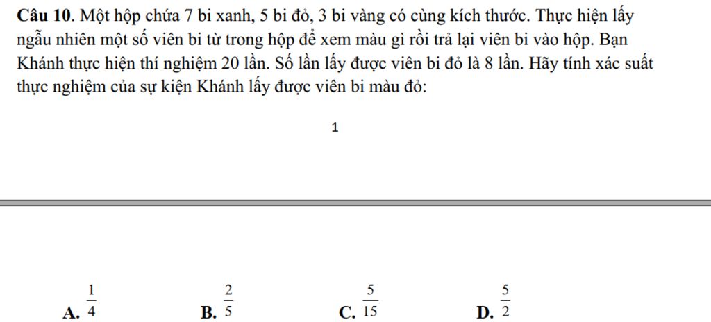 `→` Xác suất thực nghiệm của sự kiện Khánh lấy được viên bi màu đỏ là: `8/20=2/5`