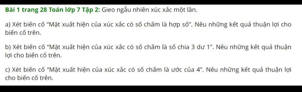 Bài 1 trang 28 Toán lớp 7 Tập 2: Gieo ngẫu nhiên xúc xắc một lần.