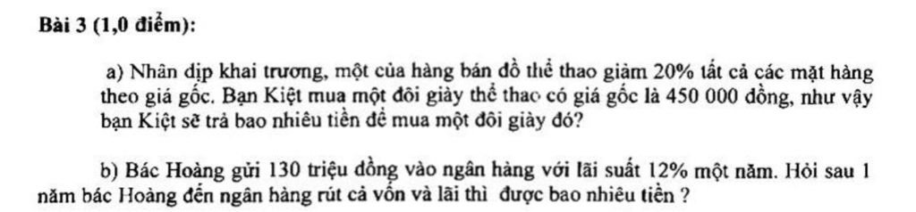 b) Bác Hoàng gửi 130 triệu đồng vào ngân hàng với lãi suất 12% một năm. Hỏi sau 1 năm bác Hoàng đến ngân hàng rút cả vốn và lãi thì được bao nhiêu tiền ?