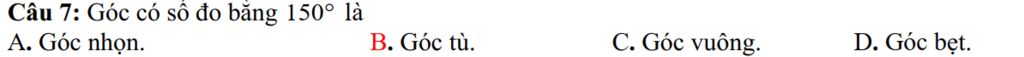 Góc có số đo là `150^o` là góc tù vì `150^o > 90^o`