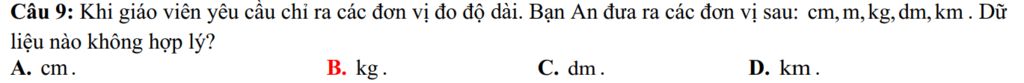 Câu 9: Khi giáo viên yêu cầu chỉ ra các đơn vị đo độ dài. Bạn An đưa ra các đơn vị sau: cm, m, kg, dm, km . Dữ