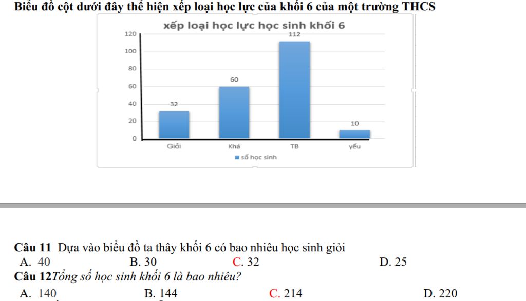 Câu 11. Dựa vào biểu đồ ta thây khối 6 có bao nhiêu học sinh giỏi