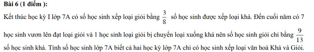 Kết thúc học kỳ I lớp 7A có số học sinh xếp loại giỏi bằng $\frac{3}{8}$ số học sinh được xếp loại khá. Đến cuối năm có 7 học sinh vươn lên đạt loại giỏi và 1 học sinh loại giỏi bị chuyển loại xuống khá nên số học sinh giỏi chỉ bằng $\frac{9}{13}$ số học sinh khá. Tính số học sinh lớp 7A biết cả hai học kỳ lớp 7A chỉ có học sinh xếp loại văn hoá Khá và Giỏi.