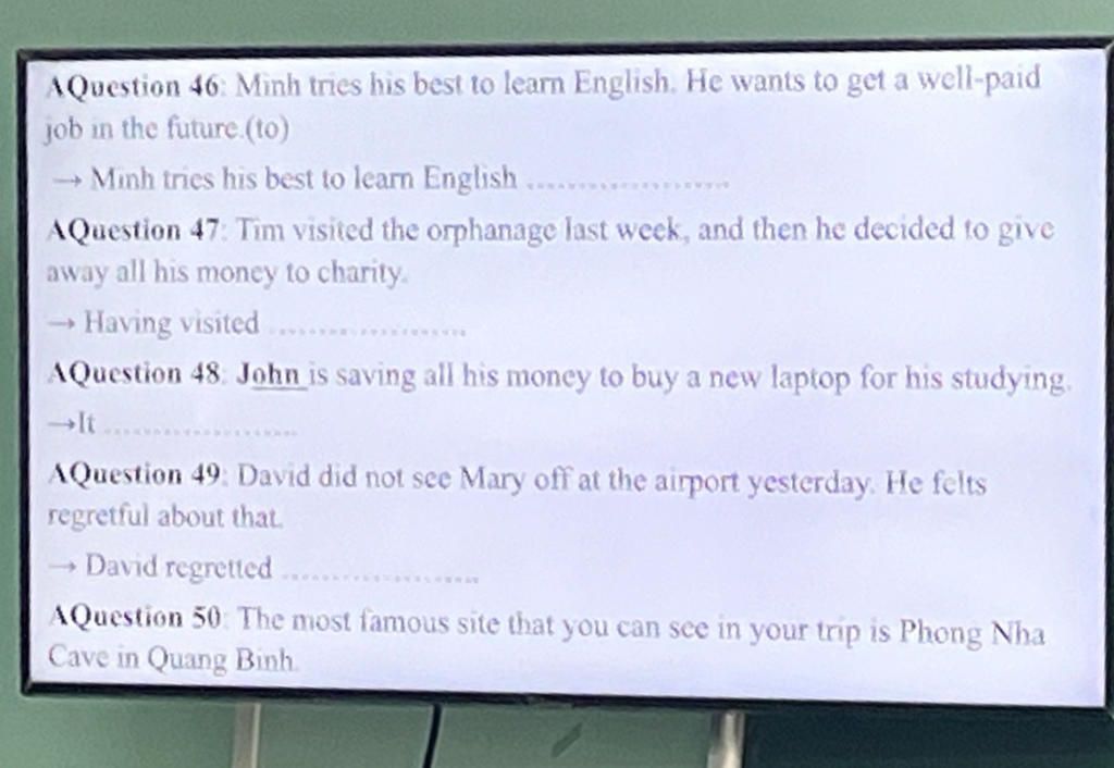 `46`. Minh tries his best to learn English to get a well-paid job in the future.