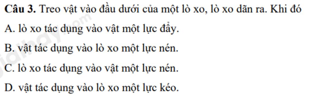 `@` Treo vật vào đầu dưới của một lò xo, lò xo dãn ra. Khi đó vật tác dụng vào lò xo một lực kéo