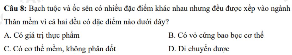 Câu 8: Bạch tuộc và ốc sên có nhiều đặc điểm khác nhau nhưng đều được xếp vào ngành Thân mềm vì cả hai đều có đặc điểm nào dưới đây?