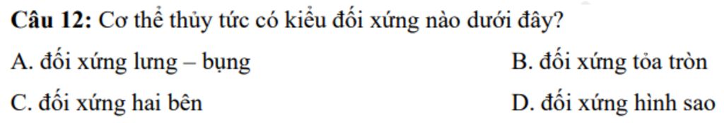 Câu `12`: Cơ thể thủy tức có kiểu đối xứng nào dưới đây?