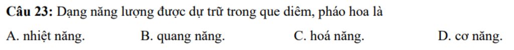 `@` Dạng năng lượng được dự trữ trong que diêm, pháo hoa là hoá năng