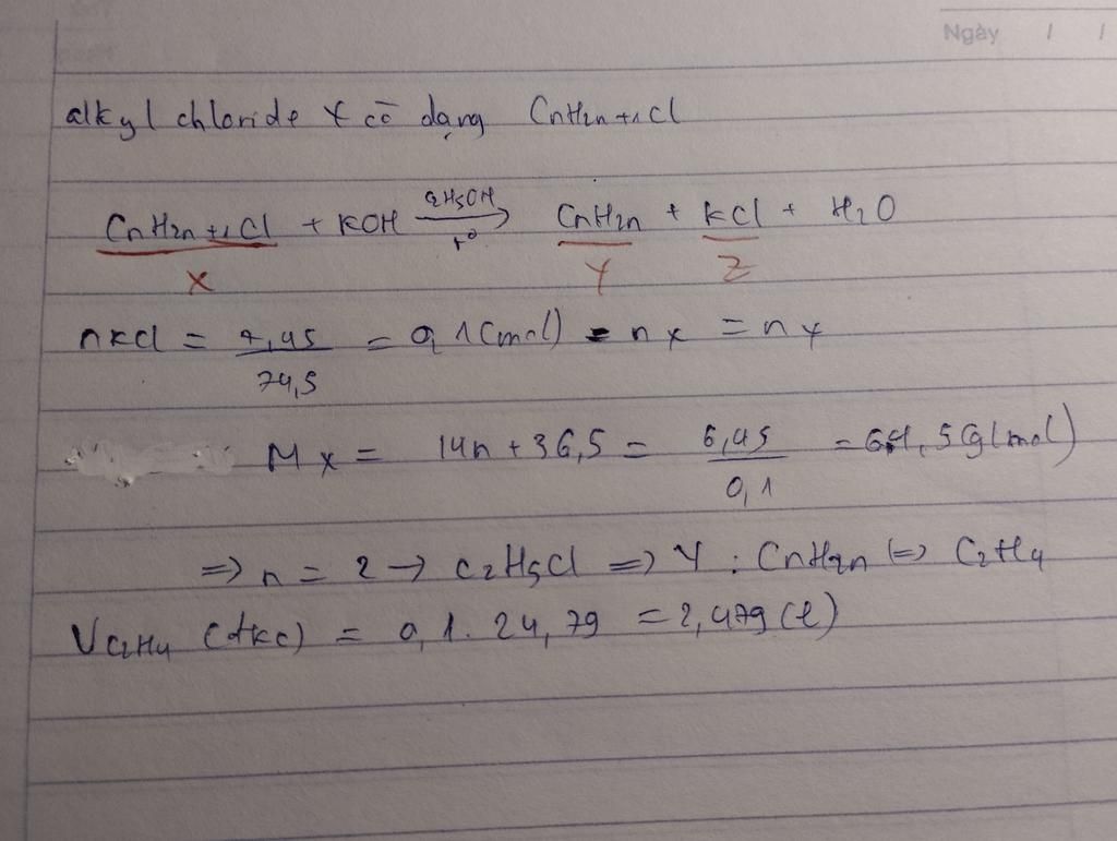 Cho 6,45 gam chất dẫn xuất alkyl chloride X tác dụng với dung dịch KOH/C2H5OH, đun nóng nhẹ, thu được V lít khí Y (đkc) và 7,45 gam muối Z. Tìm giá trị V