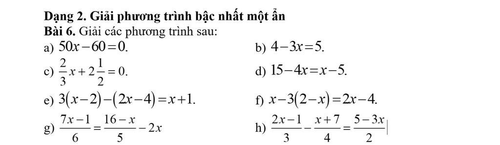 h) `(2x - 1)/3 - (x + 7)/4 = (5 - 3x)/2`
