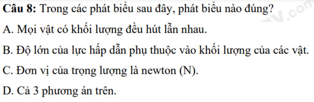 `@` Độ lớn của lực hấp dẫn phụ thuộc vào khối lượng của các vật.`->` Đúng (lí thuyết về lực hấp dẫn)