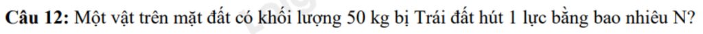 Một vật trên mặt đất có khối lượng 50 kg bị Trái đất hút 1 lực bằng số N là