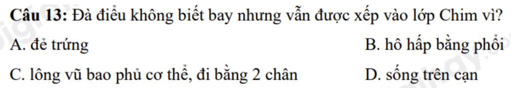 Đà điểu không biết bay nhưng vẫn được xếp vào lớp Chim vì chúng có lông vũ bao phủ cơ thể và đi bằng 2 chân, đây là đặc điểm chung của các loài chim.
