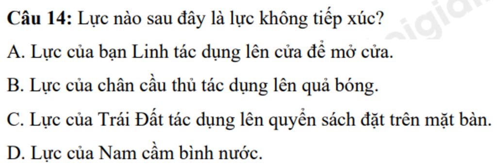 `+C` Lực của Trái Đất tác dụng lên quyển sách đặt trên mặt bàn là ví dụ về lực không tiếp xúc vì lực trọng của Trái Đất tác động lên quyển sách mà không cần sự tiếp xúc trực tiếp