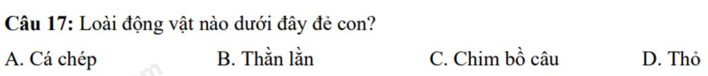 `-` Giải thích : Vì cá chép, thằn lằn, chim bồ câu là động vật nên đẻ trứng, còn thỏ là loại động vật có vú nên đẻ con