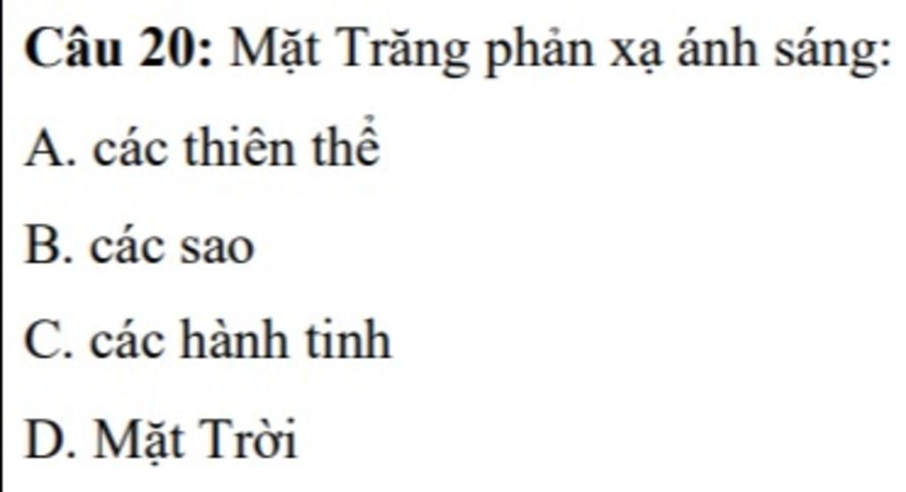 Câu 20: Mặt Trăng phản xạ ánh sáng: