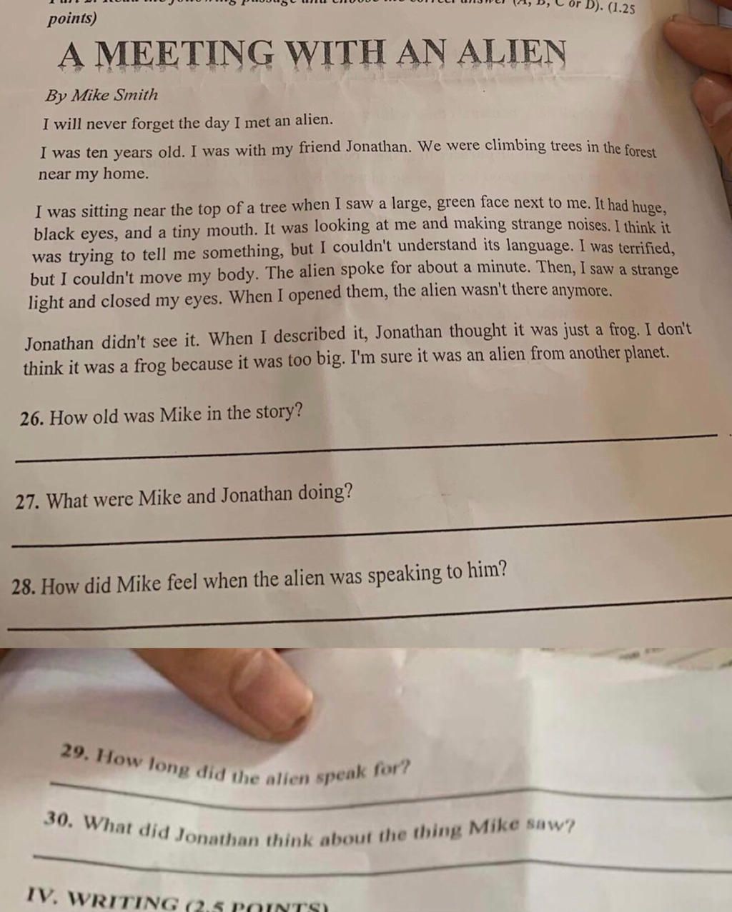 28. Mike felt terrified when the alien was speaking to him.