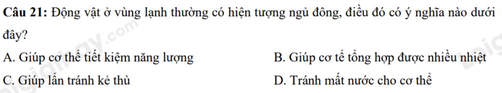 `@`Động vật ở vùng lạnh thường có hiện tượng ngủ đông, điều đó có ý nghĩa ciúp cơ thể tiết kiệm năng lượng mùa đông khi nguồn thức ăn giảm đi hoặc không có, và duy trì sự sống qua mùa khó khăn