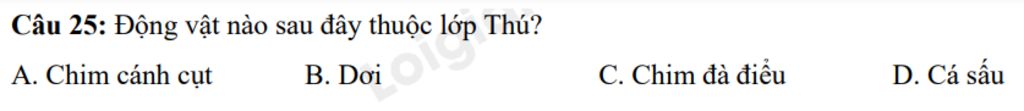 Câu 25: Động vật nào sau đây thuộc lớp Thú?