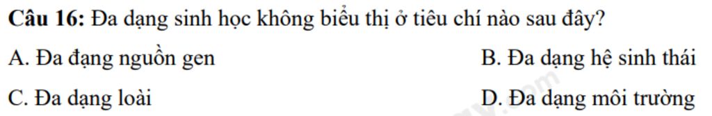 `->` Đa dạng sinh học bao gồm đa dạng nguồn gen, đa dạng hệ sinh thái và đa dạng loài, nhưng không bao gồm đa dạng môi trường.