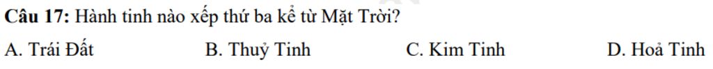 Câu 17: Hành tinh nào xếp thứ ba kể từ Mặt Trời?