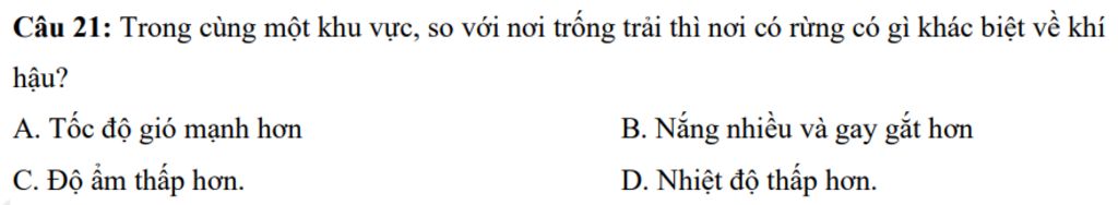 `@`Trong cùng một khu vực, so với nơi trống trải thì nơi có rừng thì nắng nhiều và gay gắt hơn vì cây rừng có thể tạo ra một lớp che phủ, hạn chế ánh nắng mặt trời trực tiếp đến mặt đất, tạo ra một môi trường bóng mát và ẩm ướt hơn