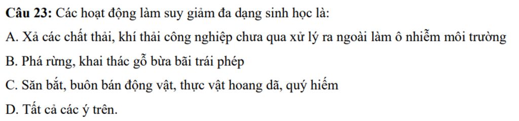 `@`Các hoạt động làm suy giảm đa dạng sinh học là: