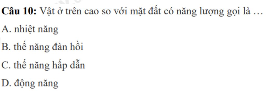 Câu 10: Vật ở trên cao so với mặt đất có năng lượng gọi là …