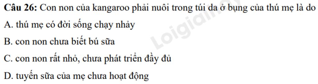 Câu 26: Con non của kangaroo phải nuôi trong túi da ở bụng của thú mẹ là do