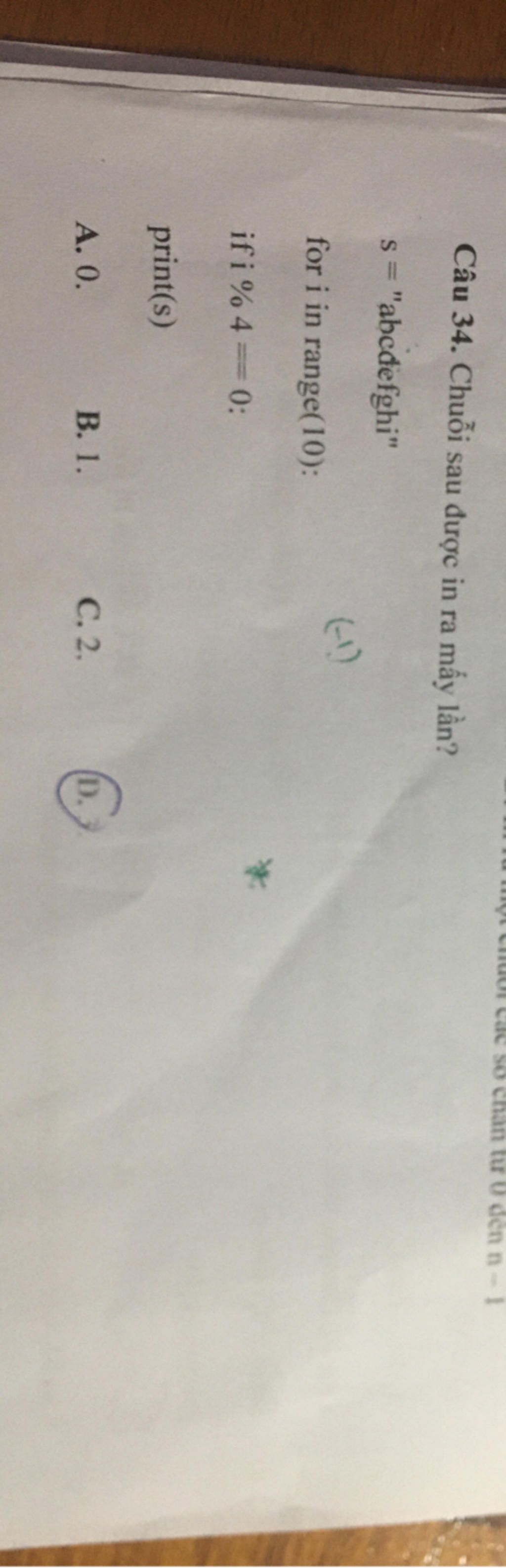 giải thích: vòng lập for sẽ chạy từ 0 đến 10-1 tức là từ 0 đến 9 và i sẽ đi từ 0 tăng lên 1 đơn vị sau mỗi lần lập. 0 đến 9 nến số nào chia hết cho 4 thì vòng lập sẽ in ra chuỗi s vậy 0 đến 9 có 3 số chia hết cho 4 là 0, 4 và 8 v chuỗi s sẽ được in ra 3 lần.